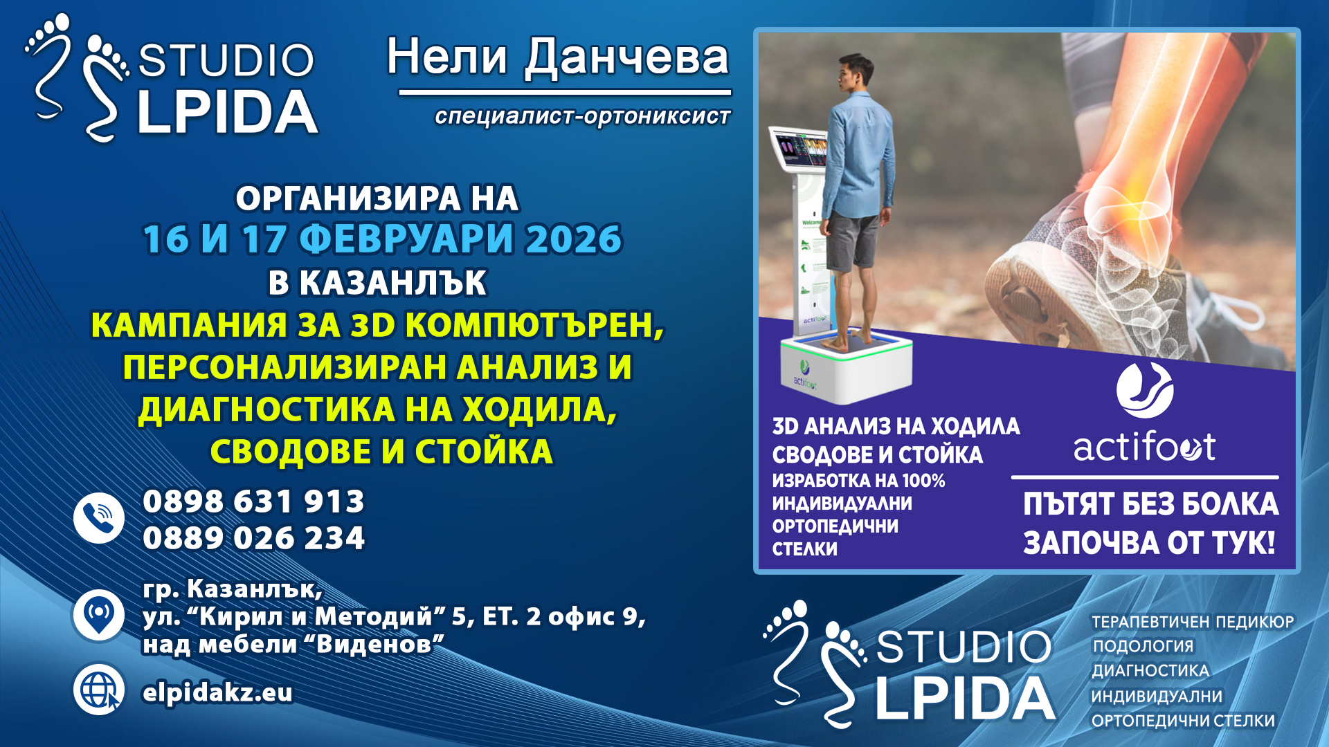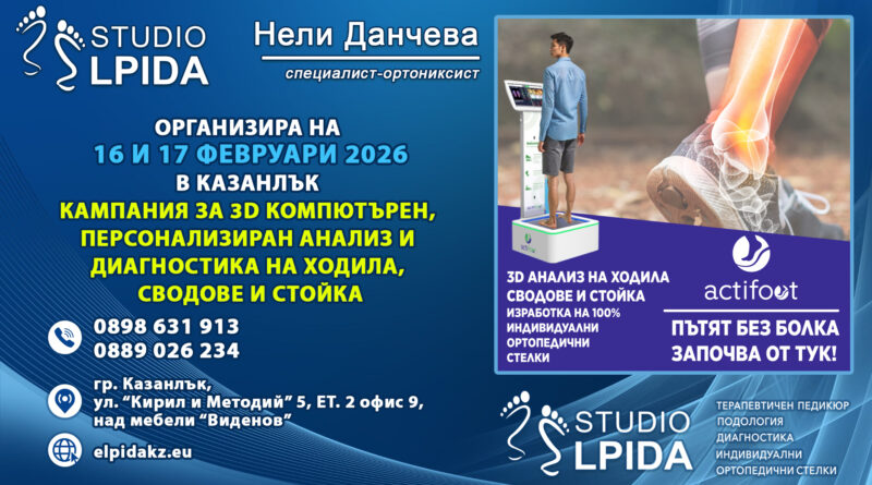 Кампания на 16 и 17 февруари 2026 за професионално тестване на ходила сводове и стойка. Изследване на анатомичната позиция и неправилната поставка на стъпалата, несъответствие в биоюеханиката, патологични изменения, деформации и усложнения. Изследване на позицията на цялото тяло.