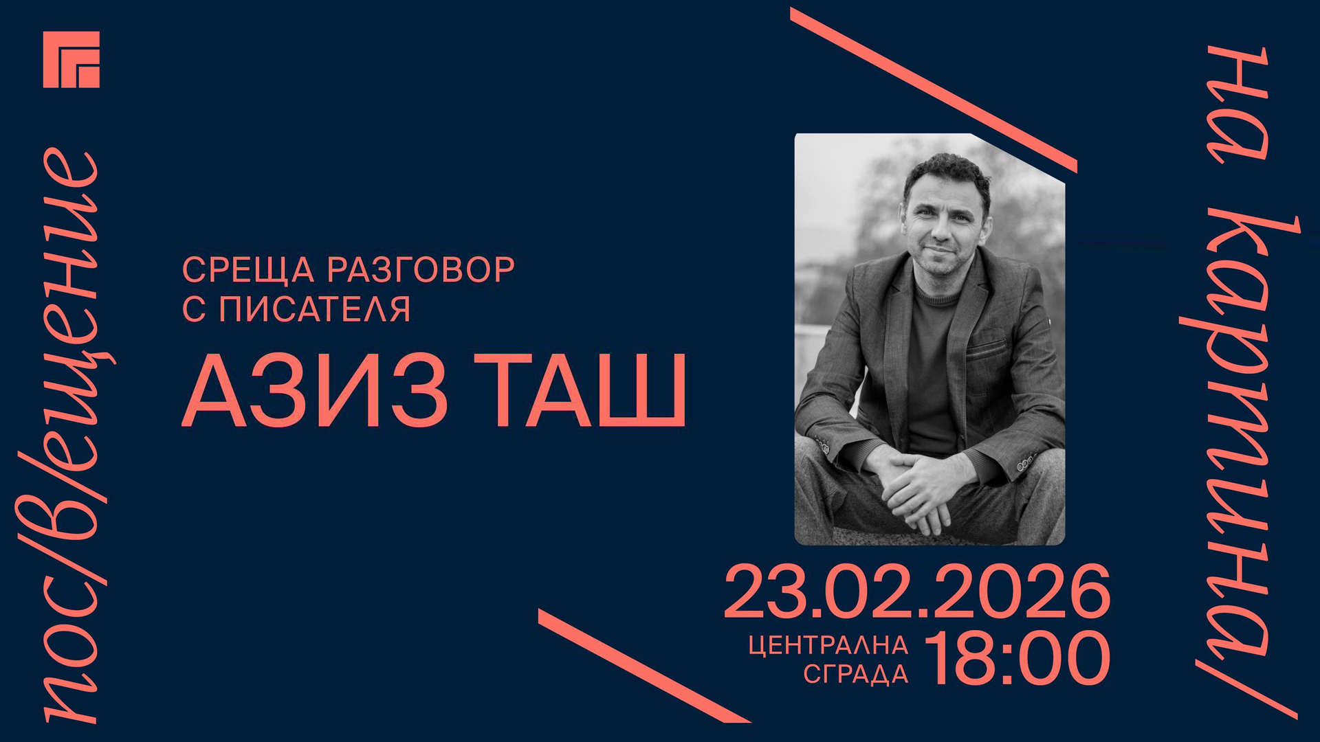Гост на нашите картини ще бъде Азис Таш. Истината е, че без да знае, той е наш гост отдавна. Защото отдавна си представяме как калиграфската естетика на поезията му допълва идеята ни за мигновения музей, за едно моментно изложбено битие, в което експонатите и страниците разменят местата си, а наблюдателят гледа към тях през изненадващия калейдоскоп на читателя. Поетът Азис Таш е взел назаем от преводача сандалите на литературния пилигрим и създава текстове, които спокойно могат да си въобразят далечен генезис, но които избират да търсят корена на световната душа във всяко едно реално-нереално място, където свойството да принадлежиш е част от ДНК-веригата. Азис Таш познава добре биологията на думата, има шесто чувство към енергийната обреченост на текстовете и тяхното клетъчно дишане. И този премерен пиетет държи внимателно с пръст брадичката на действието в първия му (засега) роман „Ниският полет над думите“, защото да се разкаже темата за аутизма и мъглата, в която се изгубват семействата на засегнатите, е нужна не само правдивост, но и нежност.