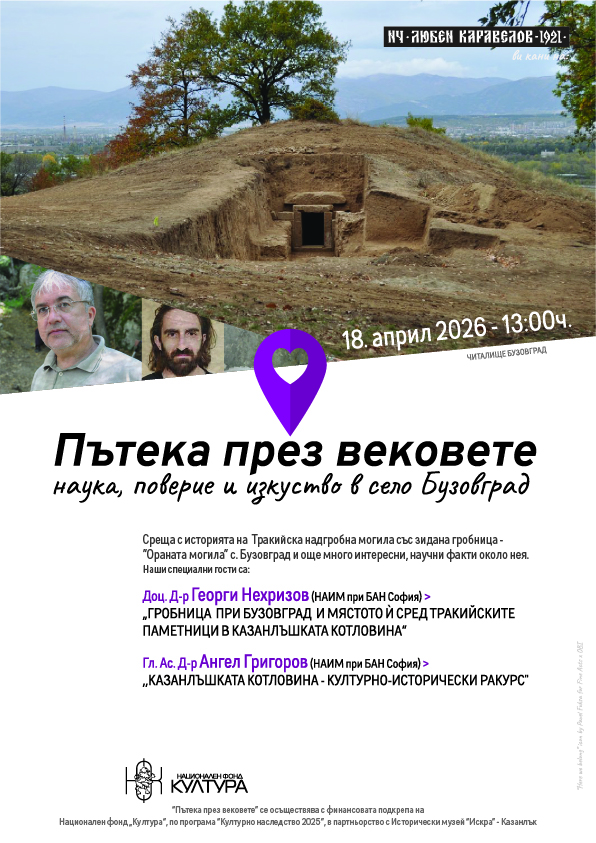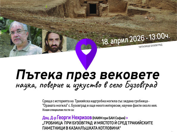 18. април 2026 – 13:00ч. > „Гробница при Бузовград и мястото ѝ сред тракийските паметници в Казанлъшката котловина“ > Публична среща-лекция за Тракийска надгробна могила със зидана гробница – ”Ораната могила” с Доц. Д-р Георги Нехризов